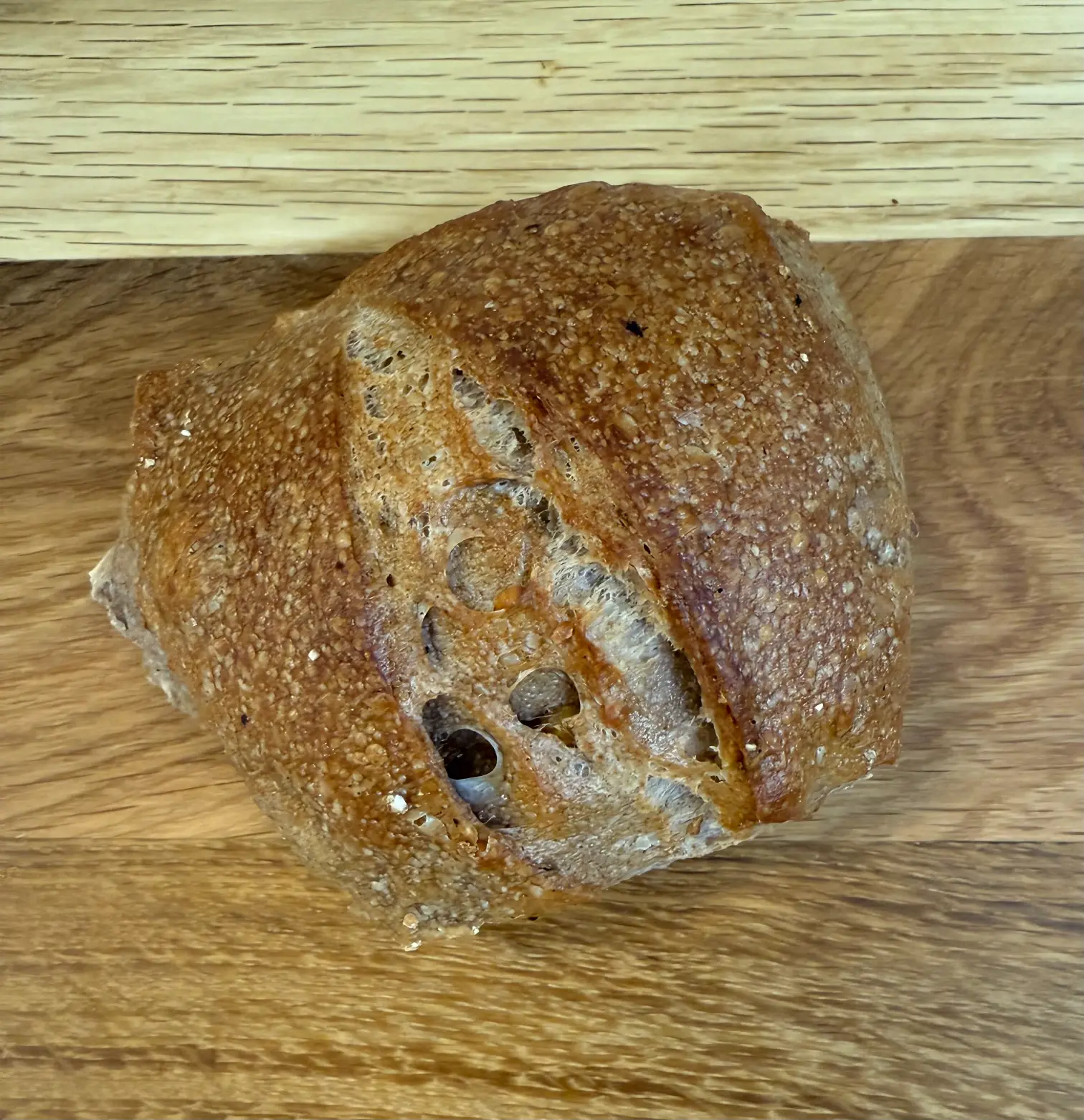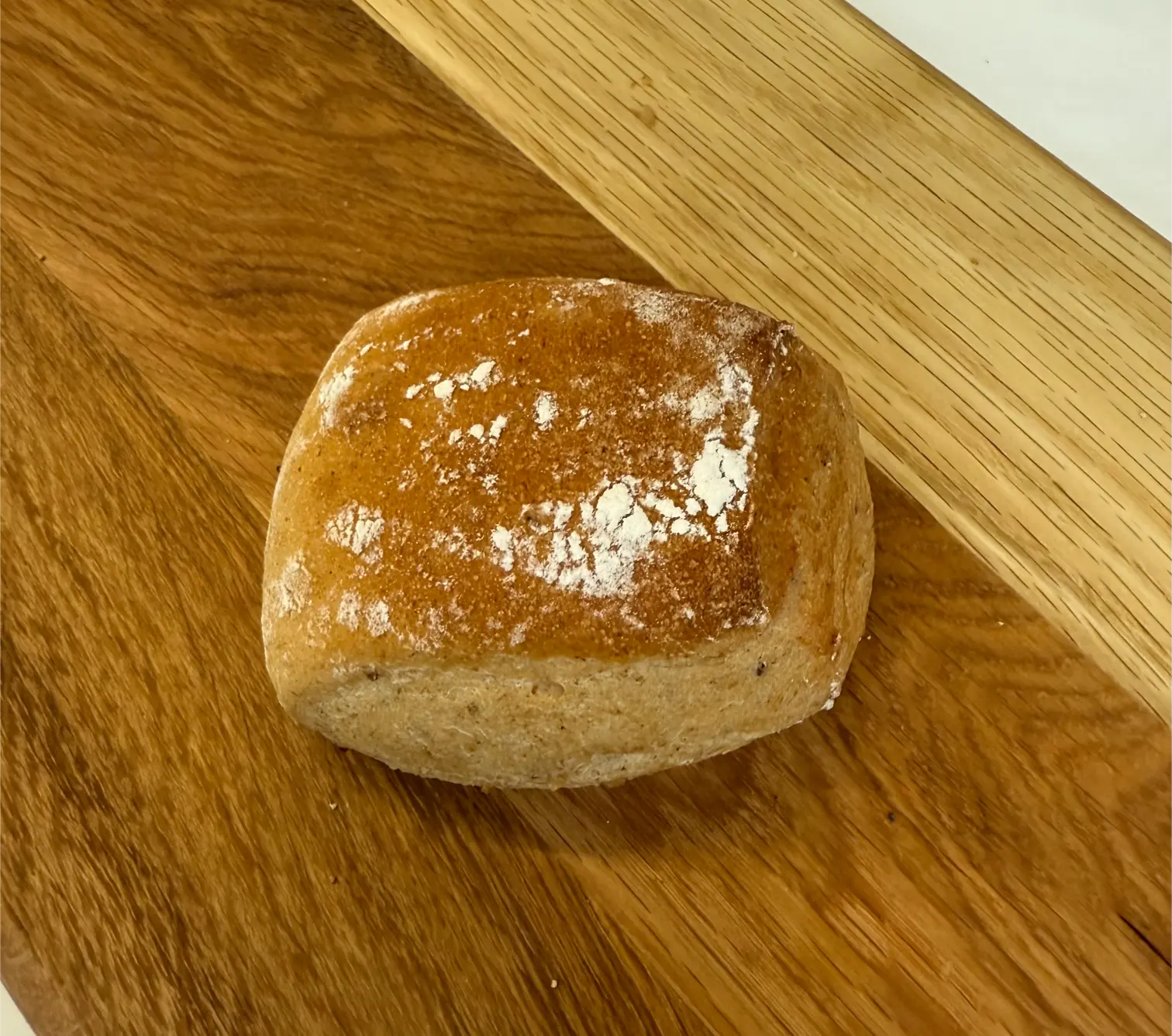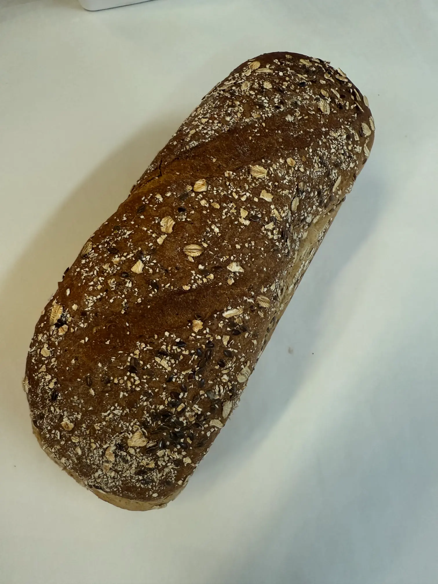 Durumvetemjöl, grahamsmjöl, vetemjöl, vatten, salt, olja, egen rågsurdeg.