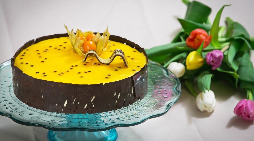 Exotisk och fräsch! Len passionsmousse med tropisk syra vilar på en saftig chokladbrowniebotten. En elegant smakresa med solig karaktär och krämig textur.