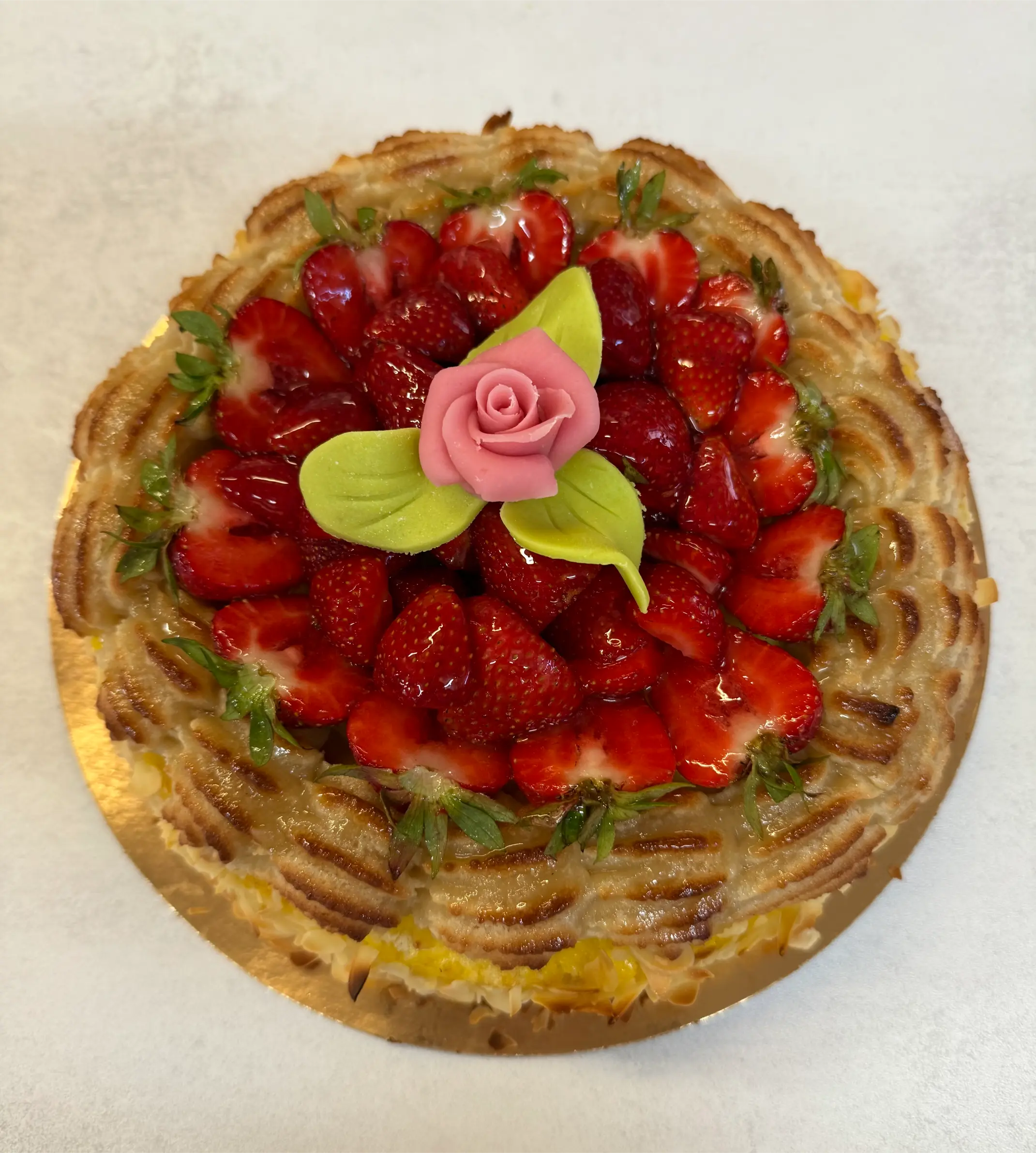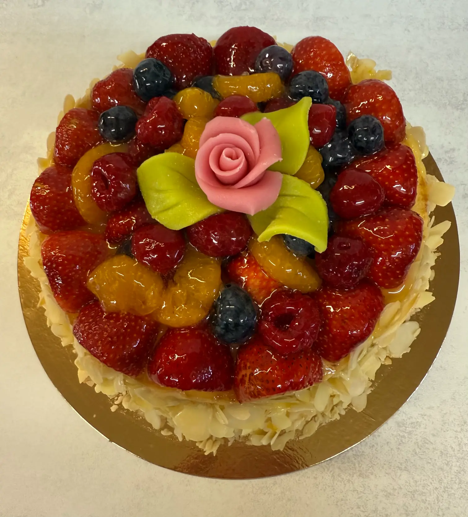 En färgsprakande klassiker! Saftig sockerkaksbotten varvas med len vaniljkräm och jordgubbssylt . Toppen pryds med säsongens bär eller frukt, täck av ett tunt gelé som ger en vackerglans och håller frukten fräsch .